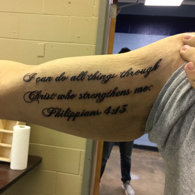 And how awesome is that industrial-chic mobile in the background (below) featuring various air filters and fixtures? Almost as awesome as this sign advising on HVAC school attire…There’s some elaborate new ink among my classmates. (Philippians…Ouch, that’s a lot of letters.)Meanwhile, back in the Building Construction Technology classroom, we started learning how to cut stringers to build staircases. For step-by-step stairway math, check out this post from earlier in the week.Classmate Maher continues to dazzle us with his carpentry skills. He has a new baby, so this week he brought in some wood he salvaged from old shipping crates and started crafting this beautiful crib (below). I continue to be so inspired by Maher’s skill and creativity in woodworking that I bought my own jack plane (below). Maher taught me how to use a plane when we were making garage doors in the fall, so when I stumbled upon this old Morhand at an estate sale, I couldn’t resist. (That’s my dog.  She’s not very handy with tools.)