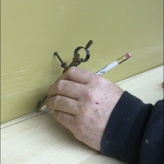 Today, this cool carpentry mentor was teaching us to scribe the uneven profile of a wall onto a flat shelf so the two surfaces would meet flush. (Imagine trying to place a flat plank against a rustic stone wall. It’s not easy.)