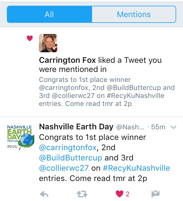 BuildMeUpButtercup can hardly wait for Earth Day, because—hold onto your hard hat—she won second place in the Metro Nashville Public Works Recyku Contest for the best recycling-related haiku! Winners get to read their Recykus on stage at 2 p.m., and 97-percent chance of thunderstorms not withstanding, Buttercup is so excited that she can hardly stop speaking in 5-7-5 meter! Who cares if there are more syllables in a haiku than there were entries in the contest? If Buttercup knows one thing, it’s that 80 percent of life is showing up.