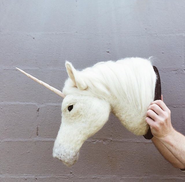 Poplectic was honored to be one of the first places Caleb ever displayed his wool biology. After that Artclectic debut, USN followed up with an exhibit in the Tibbott Gallery, featuring Caleb’s playful busts of narwhals, flamingos, and unicorns–among other unlikely fuzzy big game.