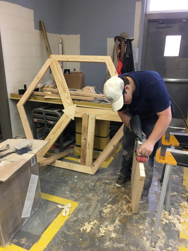 Before I knew it, I was waxing metaphorical about bees and thinking about the benefits of working in a hive, because the next day, two of my classmates were hard at work on hexagons of their own. One classmate was following my tiny template, though attempting to improve on my joinery by building a jig that would let him cut slots in the vertices to insert a “biscuit” for a seamless joint. I would never have thought of that on my own.
