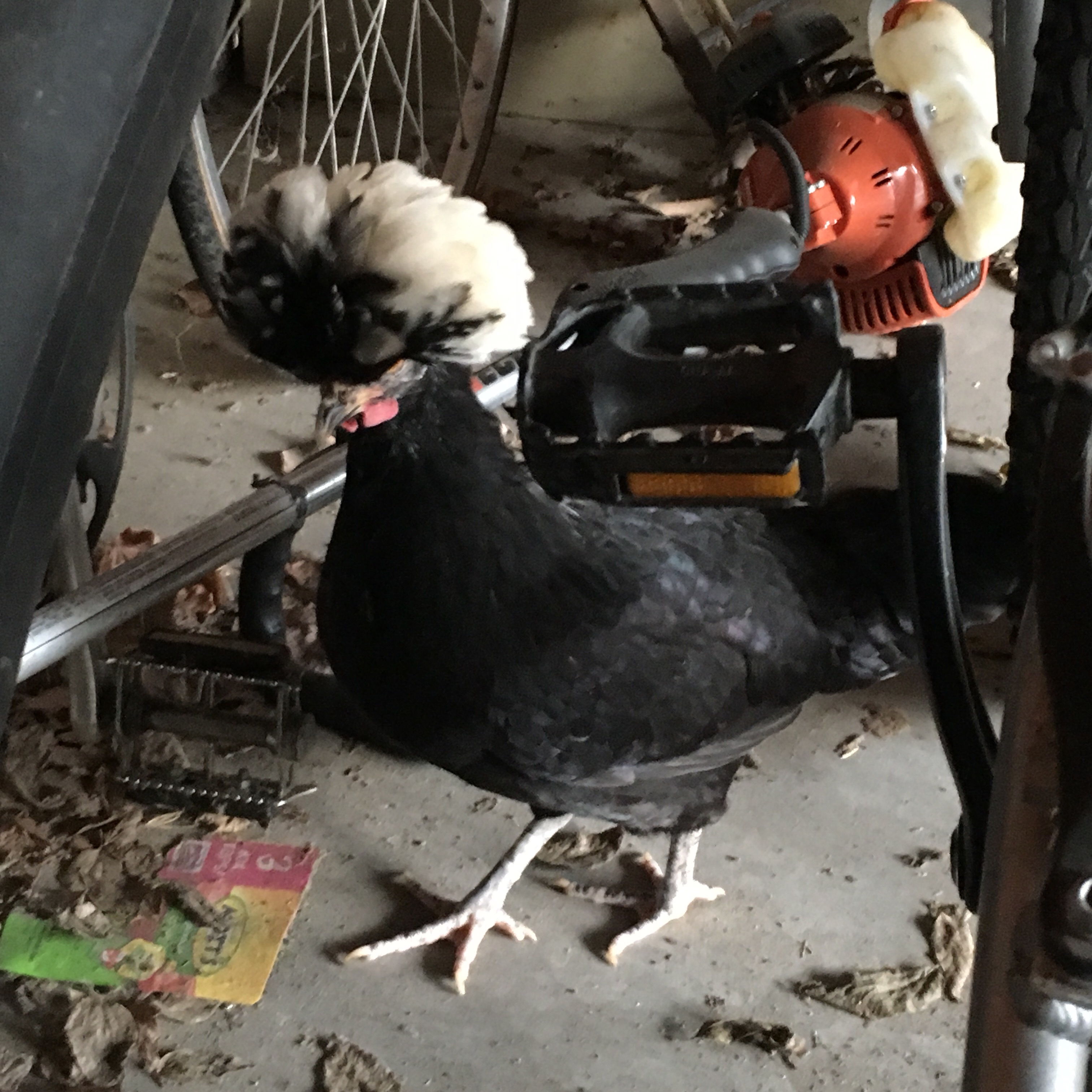 But somehow the holiday spirit derailed us from the path of least resistance, and we ended up using the scroll saw to make a hammer, a saw, and a chicken, in honor of our frequent BCT Chicken Days, when we get fried chicken for lunch. Or in honor of the actual live chickens that classmate Gabby brings to the shop every now and then. (If you ever need a laying hen, let me know and I can hook you up with Gabby. I bought a couple of gorgeous Polish cresteds from her, like the one below, seen here hanging out among the bikes in my garage. Check out that hairdo.)