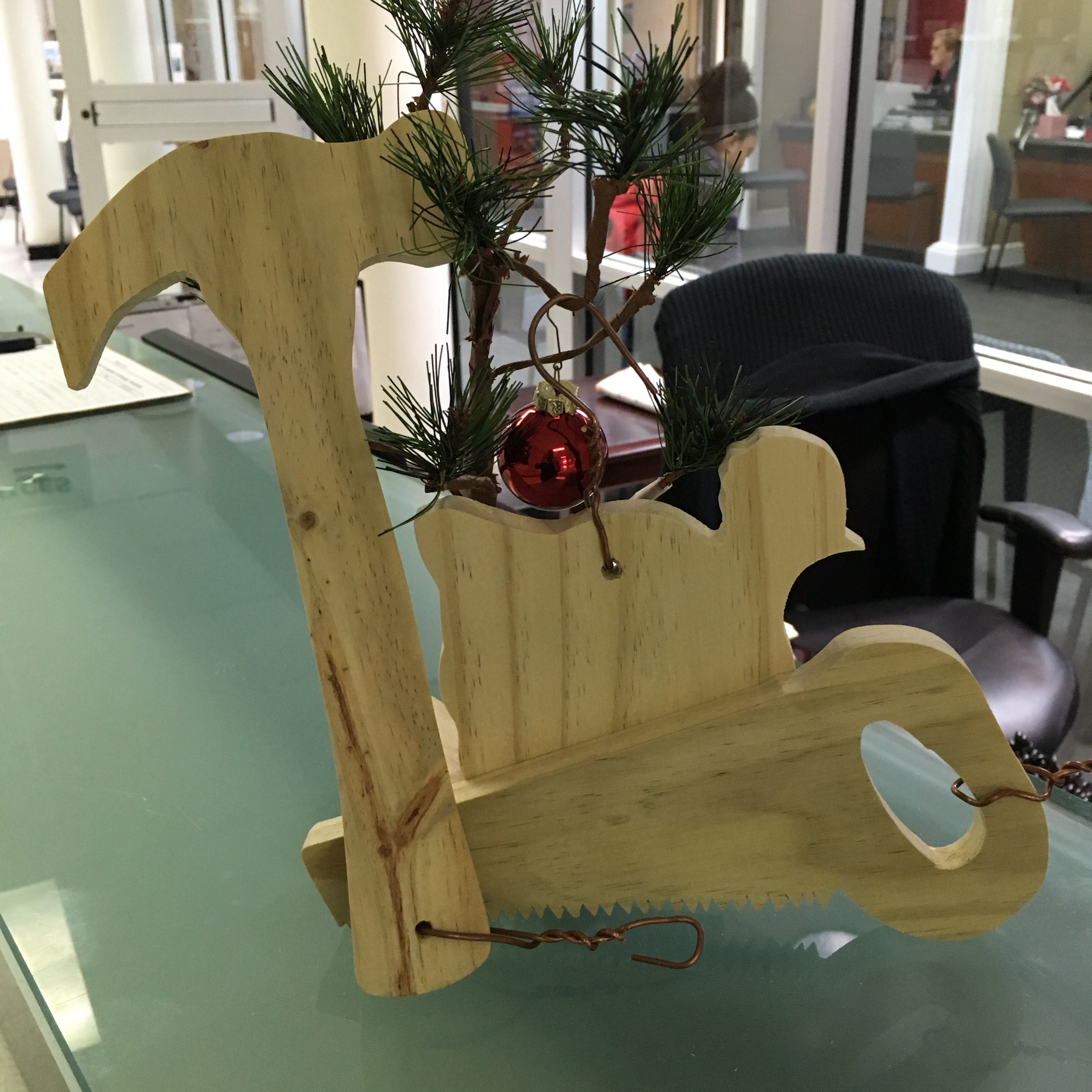 In any case, I delivered the hammer, saw, and chicken to the main office. We were the first ones to deliver our ornaments. And, from the looks of things, our next class assignment might be to build the actual tree.