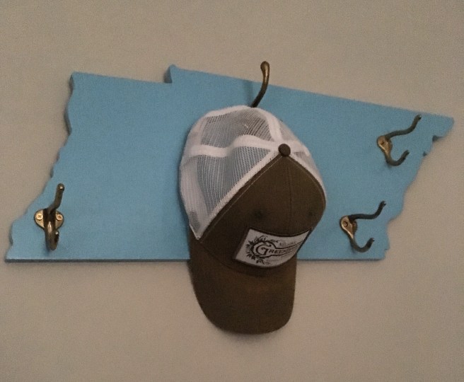 My idea was to create a hat rack that doubled as a geography lesson, with brass hooks representing major cities Nashville, Knoxville, Memphis and Chattanooga. I didn’t get the latitudes and longitudes exactly right, but the hats hang nicely.